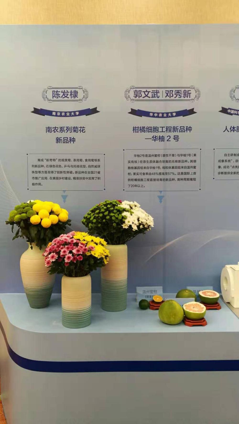 12项科研项目成果中仅有2项来自农业领域,南农系列菊花新品种的选育是其中之一,集中展示了太阳集团官网菊花育种团队育成的“新奇特”观赏菊、茶用菊、食用菊等系列新品种,在菊花花型、花色等方面取得的创新型突破,以及新品种通过全国21个省市的推广应用后,在美丽乡村建设和精准扶贫中所发挥的重要积极作用。