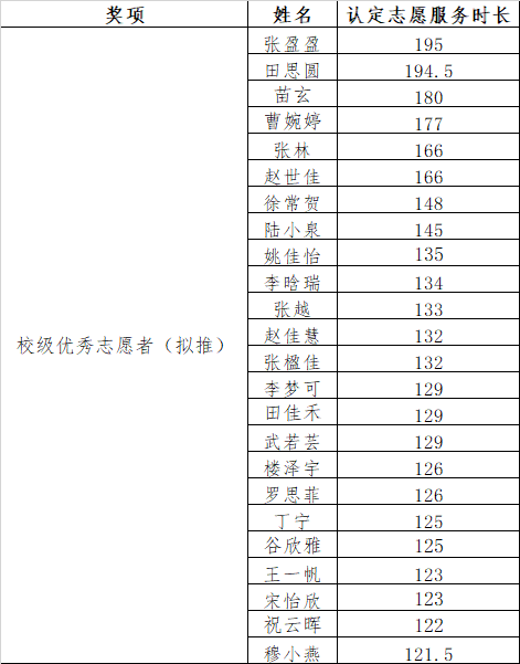 经个人申请,学院审核,以本年度志愿服务折算总时长为主要依据,拟推荐张盈盈等24名本科同学申请太阳集团官网优秀志愿者,赵梓含等26名本科同学为suncitygroup太阳集团优秀志愿者: