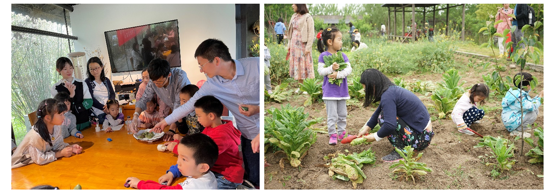 青团是江南地区的传统特色小吃,用艾草的汁拌进糯米粉里,再包裹进豆沙馅儿,不甜不腻,带有清淡却悠长的清香。下午的手工青团制作让小朋友动手实践,体验劳动,收获美味,锻炼小朋友动手实践能力。蔬菜采摘体验,让小朋友们走进大自然,感受收获的喜悦,有利于从小培养生态意识。
