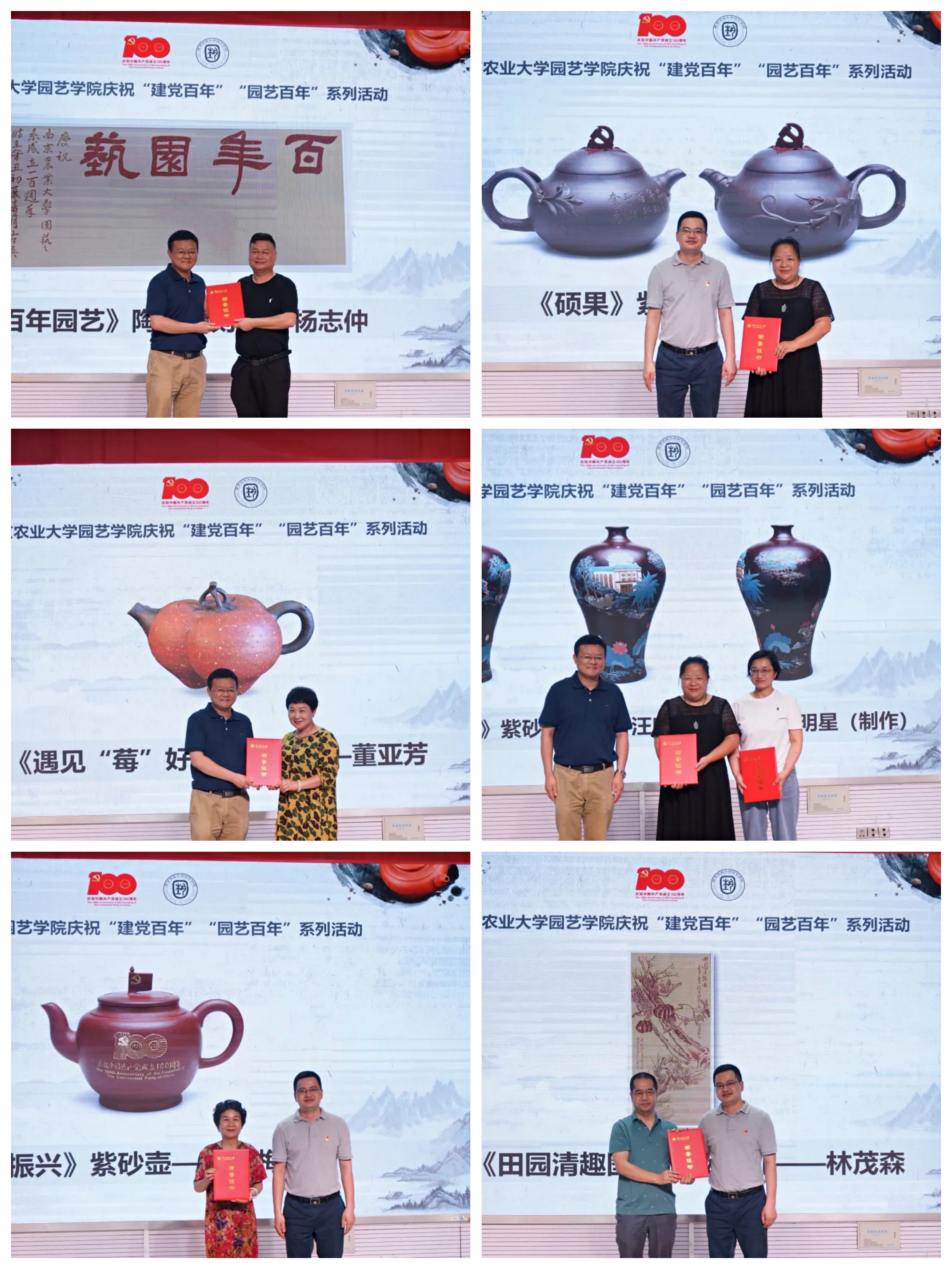 6月22日,汪叶、杨志仲、董亚芳、潘明星、刘梅仙、林茂森6位“紫砂”非遗文化传承人做客太阳集团官网suncitygroup太阳集团,将此前与园艺师生党员共同创作的6件紫陶作品赠予南农园艺,为“建党百年”“园艺百年”献礼,这些作品不仅融入了党徽、建党100周年庆祝活动标识等党史学习教育元素,绘制了主楼等南农元素,还点缀了玫瑰白菜、菊花、梨果等园艺元素。在创作过程中,大家感受到做一把好壶、一件佳作的不易,更体会到“紫砂”这一独具匠心的非物质文化遗产的魅力所在。suncitygroup太阳集团党委书记韩键、院长吴巨友、中药系教师汪涛以及suncitygroup太阳集团200余名师生参与了本次活动,活动由suncitygroup太阳集团党委副书记文习成主持。