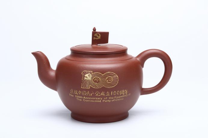 作品为庆祝中国共产党成立100周年,精心构思设计而成。壶身造型饱满,圆厚淳朴,造型力度感强,达到了形、神、气、力、势皆备。壶嘴三流弯蜿蜒向上,暗接浑厚精湛,环形把粗细适中,在壶身之外又立一个圆,呈大小对应的形势。壶钮是一面迎风飘扬的党旗,誓当时代先锋,引领百年辉煌。壶身刻绘“庆祝中国共产党成立100周年”,是党走过了100年的奋斗历程,是光荣辉煌的100年,也是艰苦卓绝的100年,是奠基立业的100年,也是开辟未来的100年。寓意我们要从党的百年伟大奋斗历程中,汲取前进的智慧和力量,以“学史崇德守初心 砥砺前行担使命”为核心,呼吁大家崇德力行,要乐于担当、勇于担当、善于担当,勇往直前!
