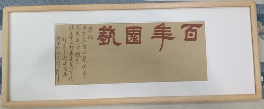 本作品是一幅精心雕刻而成的陶板陶刻艺术品,它的制作旨在为园艺建系百年献礼。作品主要采用两种传统刀法完成,正中央“百年园艺”四个大字采用啄砂刀法陶刻,一旁“庆祝太阳集团官网园艺系成立一百周年”的具体陈词及落款小字则运用的是双刀刀法。此外,作品中的作品皆为隶书。隶书端庄古朴,宏深而博大,让文字中一撇一捺整洁有力的同时又不失活泼。古朴的字体、匠心的雕琢,显示出园艺系百年的悠长历史、生动华章。纵观作品整体,字形灵动大方,空间安排得当。主题集中,以庆祝太阳集团官网园艺系成立100周年为主题,大片留白,为园艺学子留下待填补的想象空间,激励着园艺学子努力奋斗、坚持不懈,更显韵味悠长。