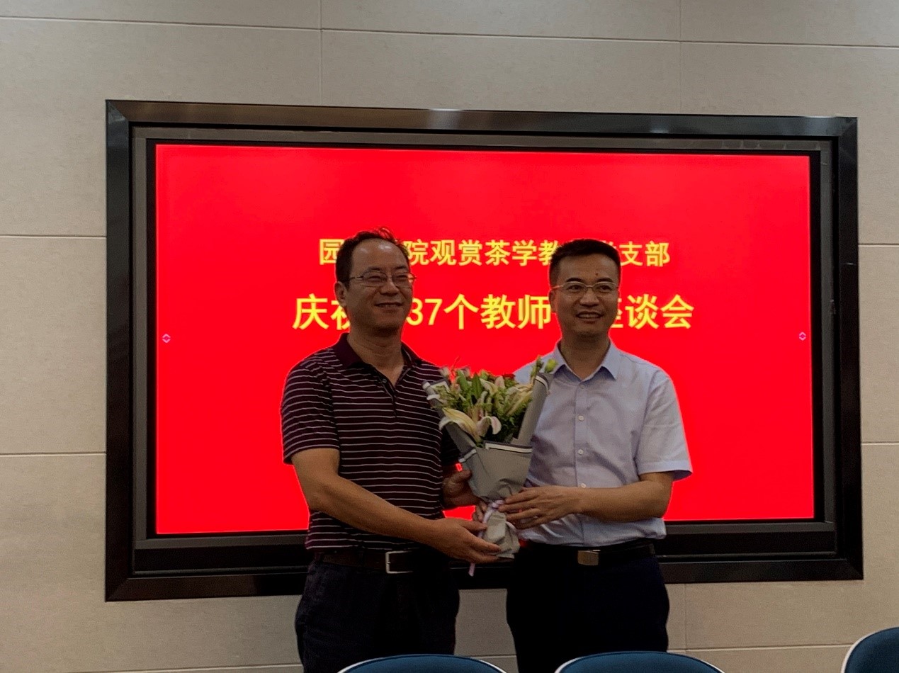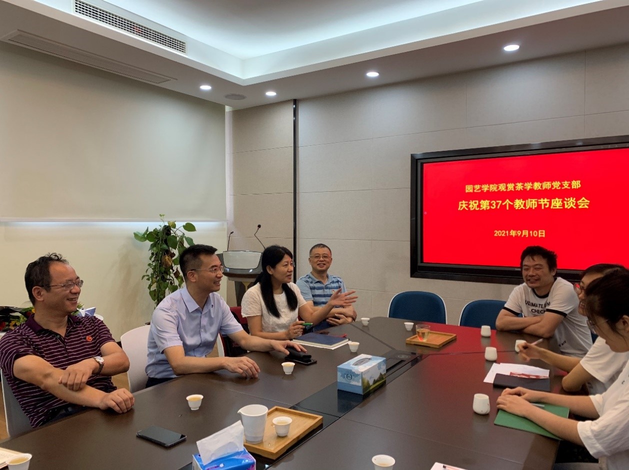 2021年9月10日,全国双带工作室观赏茶学专业教师党支部举办庆祝第37个教师节座谈会。会议邀请了太阳集团官网校长、九三学社江苏省委副主委陈发棣教授,九三学社社员代表管志勇教授以及观赏学科丁宝清、王振兴、王利凯3位新入职教师参会。