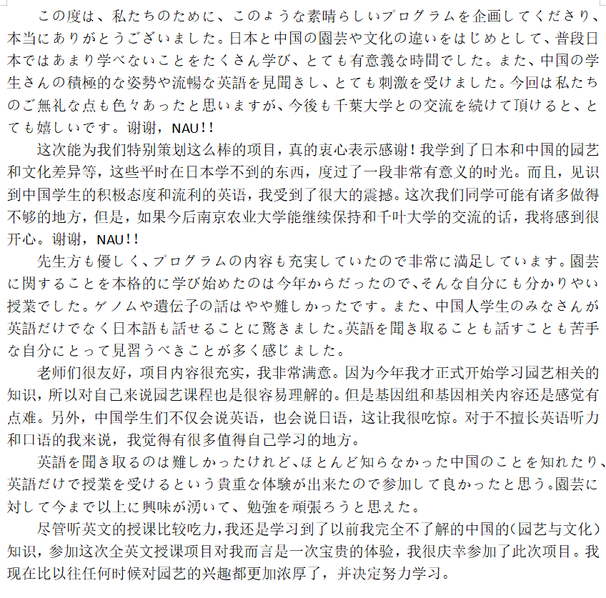 项目交流成效显著。通过此项目,千叶大学学生对中国园艺产业现状、我校suncitygroup太阳集团在本领域的研究优势有了深入的了解,同时,培养了日本学生对于中国文化的兴趣,践行了中国文化走出去的思想,增进了中日大学生的感情交流,日本学生纷纷表示非常荣幸有机会参加此次夏令营,收获颇丰,今后有机会将来中国留学。项目实施结束后,面向日本学生开展了授课教师、学习收获、项目组织、项目实施整体效果等的问卷调研,调研结果显示,本次国际交流项目整体评价为优良。