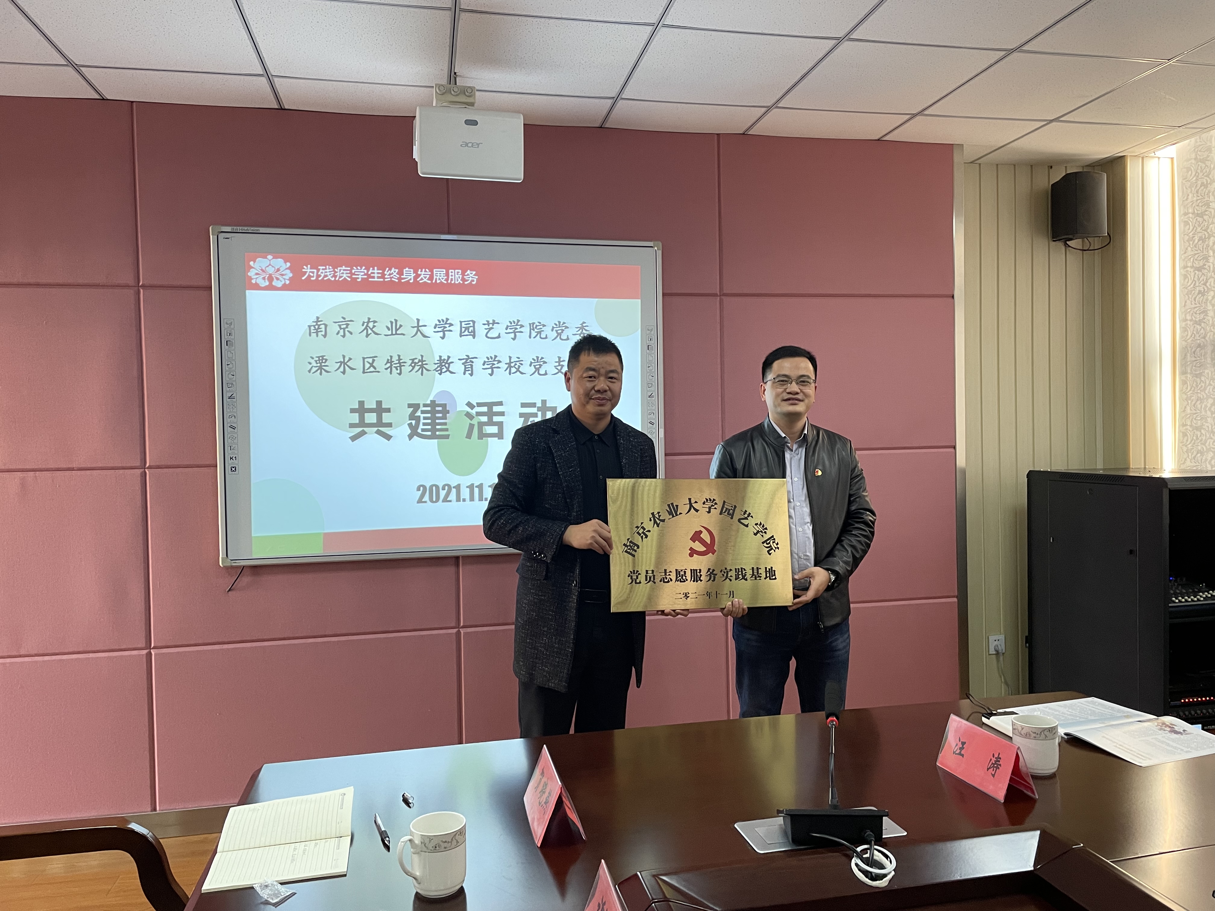 溧水区特殊教育学校创办于1986年。为解决残疾学生就业难的问题,规划并筹建了“溧水县残疾人教育、培训、就业基地”,以园艺作物为重点种植技能培训和养殖技能培训。多年来,太阳集团官网党委与溧水特殊教育学校一直保持着良好的业务合作和党建交流。此次到溧水特殊教育学校举行suncitygroup太阳集团党员志愿服务实践基地授牌仪式,既是对与会教师的一次党性和师德师风教育,也是学院党员师生与溧水特殊教育学校领导老师的一次立德树人、园艺基地建设的交流讨论。