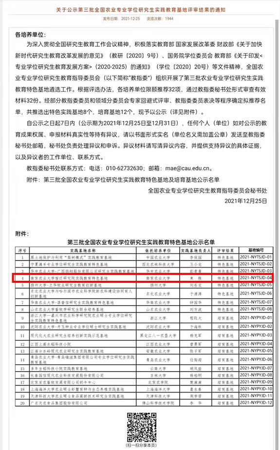 近日,全国农业专业学位研究生教育指导委员会组织开展了第三批农业专业学位研究生实践教育特色基地遴选工作。经教指委委员和领域分委员会专家评审、教指委委员表决等程序,共推选出实践教育特色基地8个,培育基地12个,南农大suncitygroup太阳集团和南农大宿迁研究院共建的特色实践教育基地成功入选。实践教育特色基地的获批,为我校在研究生实践培养方面提供了更好的载体平台。