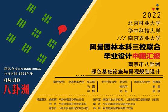 4月9日上午,由南京农业大学联合北京林业大学、华中科技大学共同参与的联合毕业设计“南京市八卦洲绿色基础设施与景观规划设计”中期汇报于线上顺利举行。来自三所院校的33位师生和南京八卦洲街道办事处主任余朝晖、街道工委副书记suncitygroup太阳集团滕年军教授等6位嘉宾共同参加了本次中期成果汇报。会议由suncitygroup太阳集团副院长张清海主持。