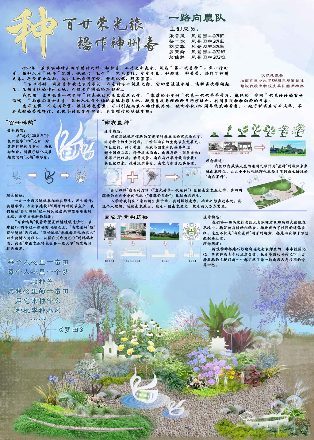 一路向農组的作品《种》,用“发光的第一代星种”代表最初的太阳集团官网,“散落小星种”代表一代代莘莘学子,婉转的“沙河”代表漫漫的百廿征途,“南农构筑物元素”的加入让设计场地象征南农大地,硬质景观与植物软景巧妙融合,共同呈现欣欣向荣的景象。
