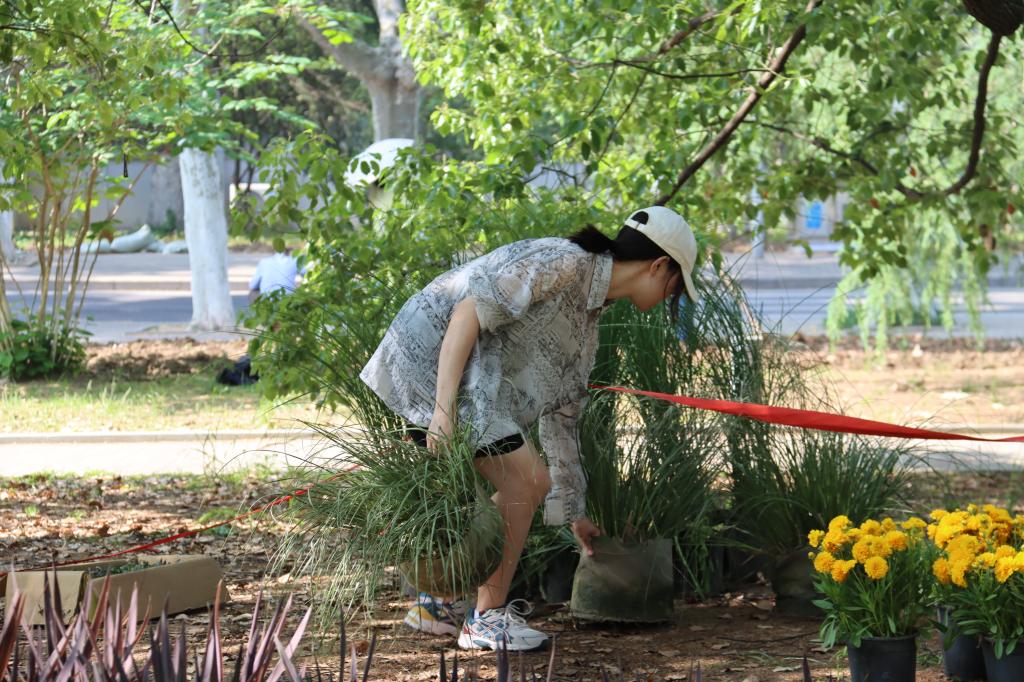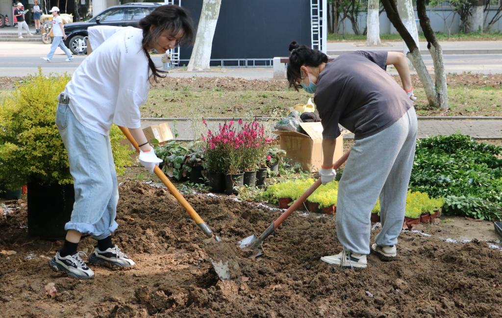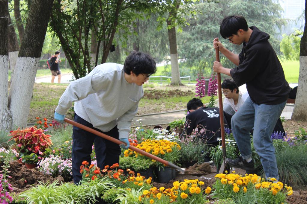 作品的构思到三维的实地呈现,这背后除了精巧的设计灵感,还有每组选手动手实践的艰辛,一座美丽的花园,从扛起一把拓荒的锄头开始,丈量土地尺寸,计算花材用量,定制材料长宽,再到松土、刨地、造坡,锄头、铁锹、石灰、水桶,一个个写在教材书、放在宣传片里的工具,一把一把的被握在了学生手中,水泡和土壤松软,脏鞋和地块平整突然有了直接的交换关系,学子们在这块被寄予了厚望的土地上辛勤劳作着,用汗水和微笑为母校搭建扎根在土壤里生日礼物。