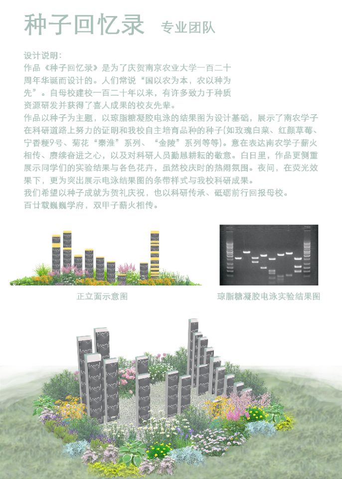 专业团队组的作品《种子回忆录》,以种子为主题,以琼脂糖凝胶电泳的结果图为设计基础,展示了南农学子在科研道路上努力的证明和我校自主培育品种的种子。意在表达南农学子薪火相传、赓续奋进之心,以及对科研人员勤恳耕耘的敬意。
