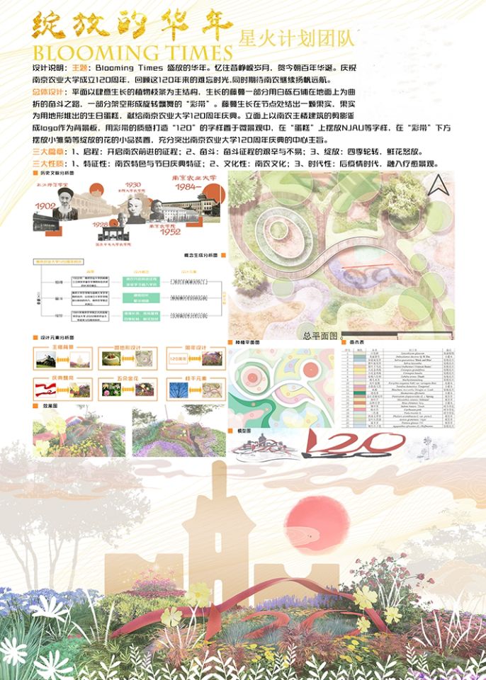 秾华春梦组的组的作品《秾华·春梦·后浪》,以“秾华·春梦·后浪”为主题,抽象海浪的形态设计园路,平面打造花海,营造庆典的氛围。用梯田的形式表示高差,使用飘带的形态做成胶卷作为构筑物,展现南农120年的风雨兼程、薪火相传。