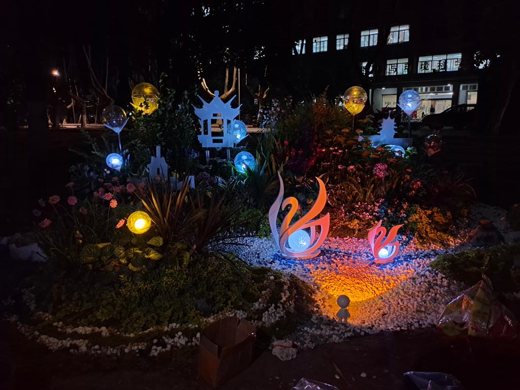 立夏后的南农,悬铃木枝叶逐渐包裹住天空,声声清脆的鸟鸣婉转悠扬的传递在学子耳边,综合楼前的绿荫小道两侧,一座座美丽的小花园在一个周末的时间突然建造了起来,花叶连翘、黄金枸骨、火焰南天竹等五彩的观赏植物在土地上摇曳生姿,石子、飘带、彩灯等各式的装饰点缀其内,不同意蕴风采的微景观呈现在往来的师生面前。