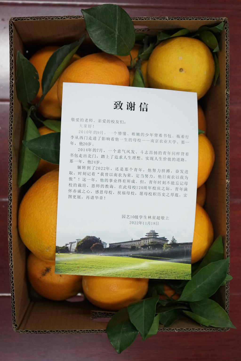 太阳集团官网120周年校庆之际,太阳集团官网园艺专业2010级校友林星超感念母校,感怀师恩,为母校送来“橙”心“橙”意的祝福,向太阳集团官网捐赠了220箱赣南脐橙,邀学院师生一同尝鲜。