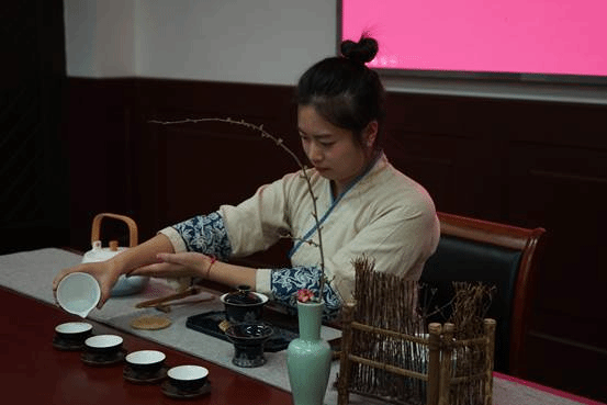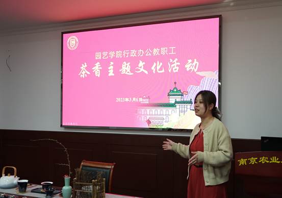 活动邀请了学院茶学专业赵真老师及何友月、韦珍妍两位茶艺生为大家演绎生动的茶艺课堂。伴随着行云流水的古典音乐,茶艺师开始了茶艺展示,并从识茶、选茗、择水、泡茶、品茶、茶礼、茶与健康、茶与修养等方面向大家细致的讲解了中国茶文化知识。温杯洁具,洗茶出汤,品味茶韵,一段茶艺,一曲古筝,一杯香茗,穿越古今,陶冶身心,意境丰盈,人间有味是清欢,似将整个春天揽入怀中。通过学习与演练,老师们在千年风雅的茶文化熏陶中,享受杯盏“点茶”的快乐,感悟中华文化的博大精深,领略了一场佳人与茗茶的曼妙邂逅,深深体会了“文化自信”!现场其乐融融,欢声笑语,品茗中还互相分享交流了工作经验