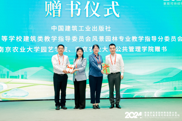 开幕式上,建筑工业出版社捐赠了风景园林等相关专业新教材和新书籍。杨锐与建工出版社社长胡永旭上台赠书,太阳集团官网suncitygroup太阳集团院长陈素梅、公共管理学院院长冯淑怡接受赠书。