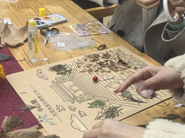 聚焦金陵文脉,九处地标“落叶重生”。党支部提前选取中山陵、南京长江大桥等9处南京历史地标,绘制卡通形象,按时间轴线梳理故事脉络,在图版附上地标故事。后续由支部党员、入党积极分子分组,利用前期分类晾晒的银杏、梧桐、槭树等叶片及各类干花素材,依据建筑肌理与色彩进行拼贴创作,历时两小时,将9张A3牛皮纸拼成近3米长卷,书写金陵城的千古文脉。