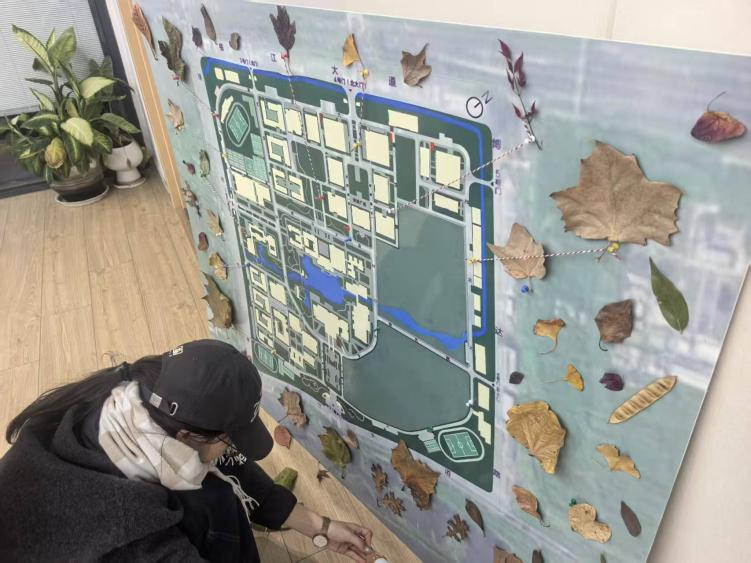 收集校园落叶,资源地图“独家发布”。支部党员利用课余时间,分小组对滨江校区主要道路、草坪、坡地进行实地探查与落叶收集,同时定制150cm×120cm大小校园地图展板,以棉绳、大头针和实物落叶为材料,标注收集点并附上相关植物介绍,形成首张“南农落叶资源地图”。