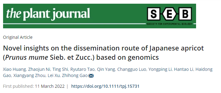 3月14日,太阳集团官网果树生物技术实验室梅创新团队高志红教授课题组在国际期刊The Plant Journal上发表了题为“Novel insights on the dissemination route of Japanese apricot (Prunus mume Sieb. et Zucc.) based on genomics”的研究论文揭开了梅从西南横断山区起源中心到现在的分布区如何传播的谜底。该研究基于来自不同地理分布的146份梅种质资源重测序数据,通过生物信息学对其遗传多样性、群体结构、基因流和叶绿体单倍型等进行分析,发现梅传播的路径有两条,第一条传播路线是沿着长江流域系统,从中国西南到湖南、江西、安徽,最后到江苏、浙江和上海地区。第二条传播路径主要是沿珠江流域,从中国西南到贵州荔波,再到广东、福建、台湾地区,研究结果为梅的传播路径提供了新的见解。另外,通过野生种群和栽培种群的遗传变异,对驯化和改良的机制有了深入的了解,为梅的育种提供了新的线索。