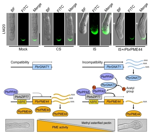 该研究发现,在梨自交不亲和反应中,乙酰转移酶PbrGNAT1通过对无机焦磷酸酶PbrPPA5第42位赖氨酸残基的乙酰化修饰,促进乙酰化的PbrPPA5在花粉细胞核富集。细胞核中,PbrPPA5作为共抑制因子,与转录因子PbrbZIP77互作并共同抑制果胶甲酯酶基因PbrPME44的表达。PbrPME44的下调阻碍了花粉管尖端甲酯化果胶向去甲酯化果胶的转化,打破了甲酯化果胶和去甲酯化果胶的浓度平衡,使梨不亲和花粉管尖端细胞壁中甲酯化果胶大量积累,导致花粉管尖端膨大。