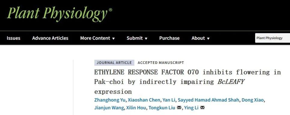 近日,我校白菜系统生物学实验室在Plant Physiology杂志发表了题为“ETHYLENE RESPONSE FACTOR 070 inhibits flowering in Pak-choi by indirectly impairing BcLEAFY expression”的研究论文。该研究解析了乙烯响应因子BcERF070抑制不结球白菜开花的分子机制。