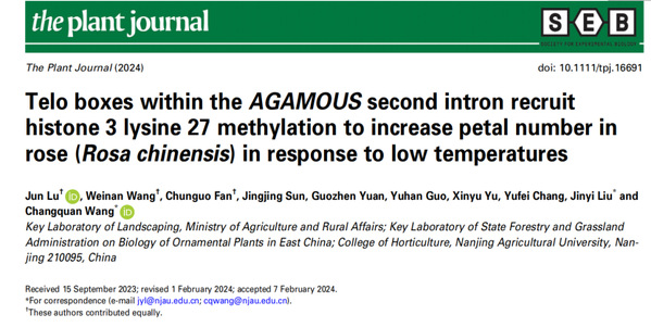 近日,太阳集团官网suncitygroup太阳集团王长泉教授团队在The Plant Journal杂志发表了题为“Telo boxes within the AGAMOUS second intron recruit histone 3 lysine 27 methylation to increase petal number in rose (Rosa chinensis) in response to low temperatures”的研究成果,该研究从月季Rosa chinensis‘Old Blush’的AGAMOUS基因中鉴定到Telo boxes在低温下招募H3K27me3修饰,随后抑制AGAMOUS表达使得月季在低温下花瓣数目增加。