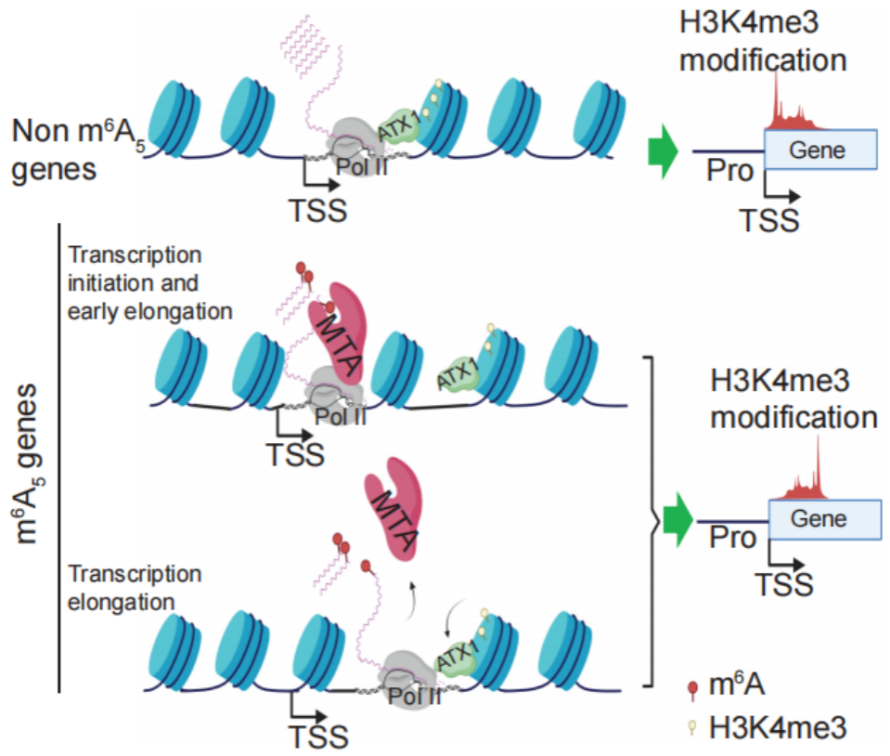m6A是真核生物中最常见且保守的RNA修饰之一,广泛参与基因表达及生长发育调控。以往研究主要聚焦于m6A在3’ UTR的功能,而其在5’ UTR的作用及其与组蛋白修饰的关系尚不明确。叶片衰老不仅影响作物的产量和品质,还决定了观赏植物的观赏价值和商品价值,然而m6A修饰调控叶片衰老的分子机制鲜有报道。该研究通过对菊花、双子叶模式植物拟南芥以及单子叶模式植物水稻的转录组和meRIP-seq数据的深入分析,揭示了m6A修饰与组蛋白修饰之间的互作调控机制:在转录起始或早期延伸过程中,m6A甲基转移酶MTA优先结合RNA Pol II的Ser5P-CTD结构域以增加新合成mRNA 5’ UTR区域的m6A修饰,同时竞争性地取代ATX1,从而减少H3K4me3修饰,导致转录起始或早期延伸效率下降;随着转录的进行,ALKBH10B与MTA竞争结合RNA Pol II,降低5’ UTR区域外的m6A修饰,进而重新招募ATX1恢复H3K4me3修饰。这种ATX1与RNA Pol II的动态结合最终导致H3K4me3修饰的移位。借助团队前期建立的“园艺作物关键基因挖掘多组学联合分析平台”(Cheng et al., Plant J, 2023, 116(4):1018-1029),该研究挖掘到下游调控基因SBPASE,并通过遗传学、分子生物学等实验进一步验证了m6A在5’ UTR的修饰可通过调控H3K4me3的移位来影响该基因表达和叶片衰老。该研究提出了植物叶片衰老调控的新机制,为理解m6A与组蛋白修饰之间的相互作用提供了新视角,也为未来研究m6A修饰在植物生长发育中的功能奠定了的理论基础。