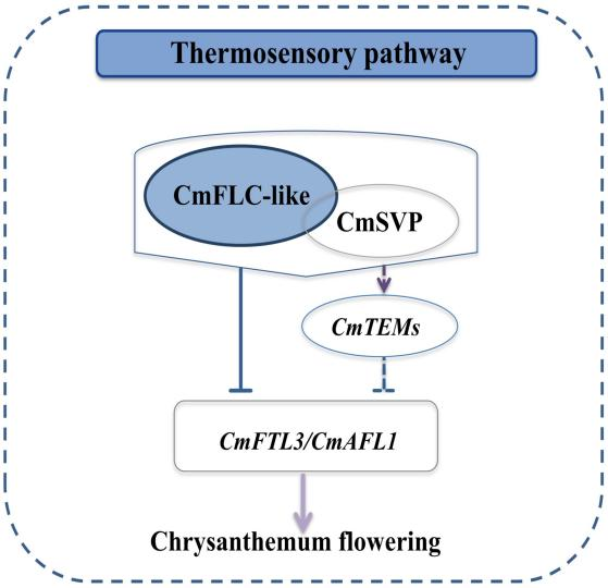 温度是影响菊花开花的重要环境因素,低温抑制菊花开花。在菊花冬季反季节生产中,由加温导致的高能耗成本,严重制约了菊花产业的健康发展。本研究发现,菊花温敏路径的关键基因CmFLC-like响应低温上调表达,其可以直接抑制开花素基因CmFTL3和花分生组织决定基因CmAFL1的表达,从而导致菊花低温下晚开花。此外,研究发现CmFLC-like与MADS-box基因家族成员CmSVP相互作用,其部分依赖CmSVP抑制CmFTL3的表达,从而介导菊花的成花转变。该研究为深入理解低温调控菊花开花提供了新的认知。